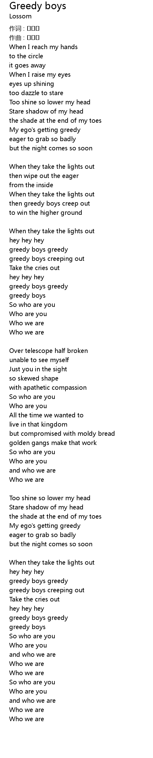 | then greedy boys creep out | |