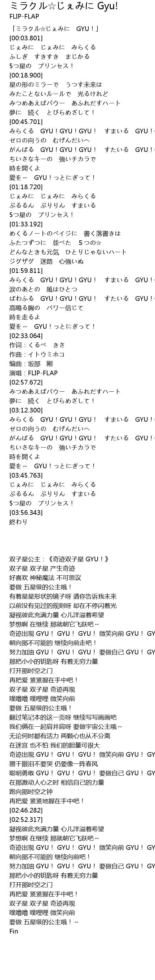 | [00:00.300] | 「ミラクル☆じぇみに GYU!」 |