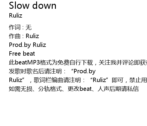 | 发歌时歌名后请注明:“Prod.by Ruliz”,歌词栏编曲请注明:“Ruliz”即可,禁止用于商业性质,尊重知识产权,侵权必究,谢谢。 | |
