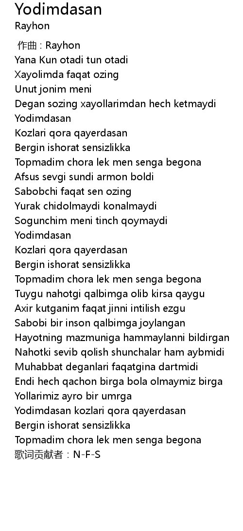| [03:01.00] | Topmadim chora lek men senga begona |