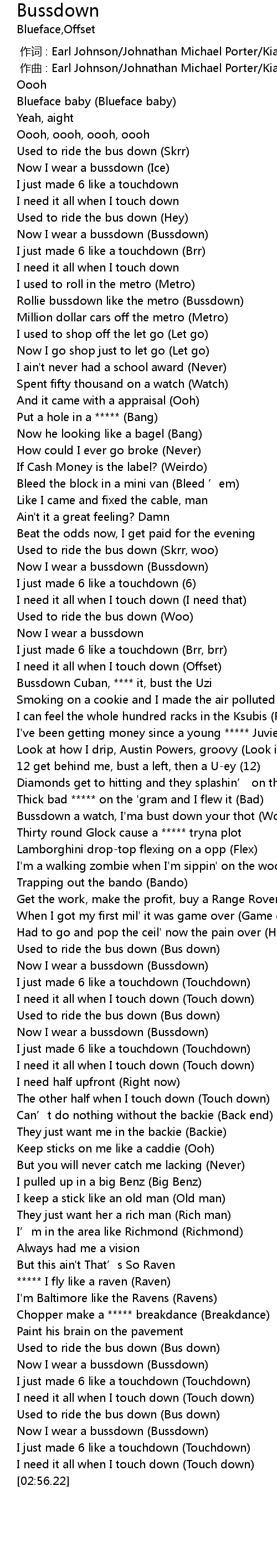 | [01:17.75] | I need it all when I touch down Offset |