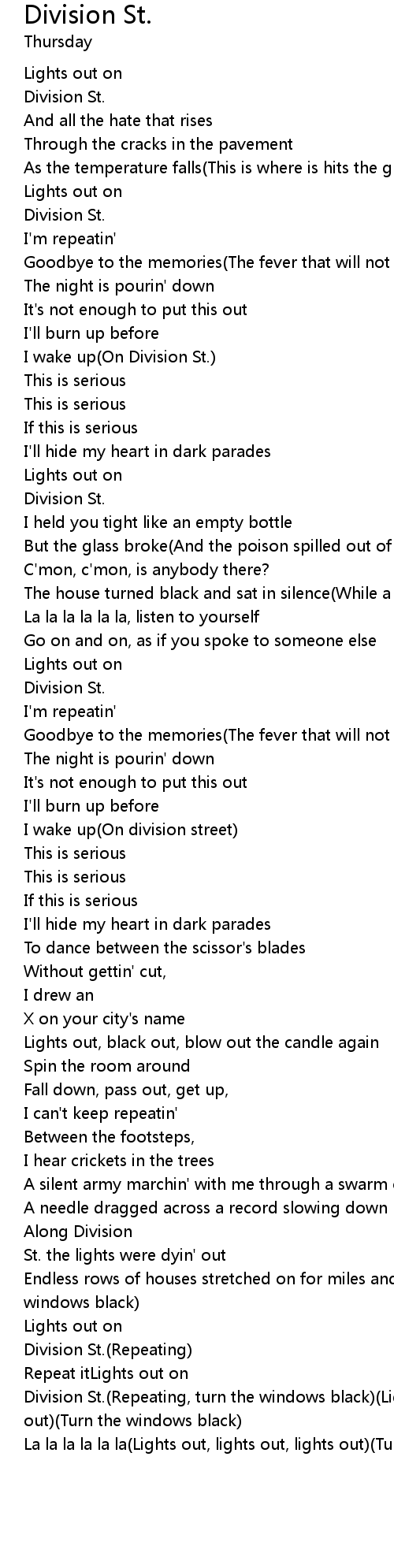 Division St.(Repeating, turn the windows black)(Lights out, lights out, lights out)(Turn the windows black) |