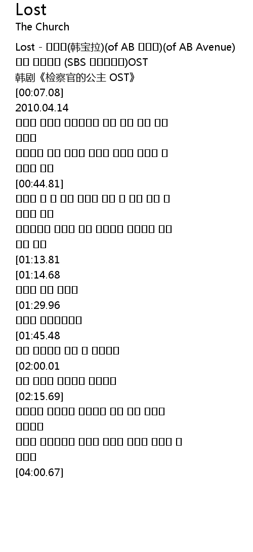 | [00:01.37] | Lost - 한보라(韩宝拉)(of AB 에비뉴)(of AB Avenue) |