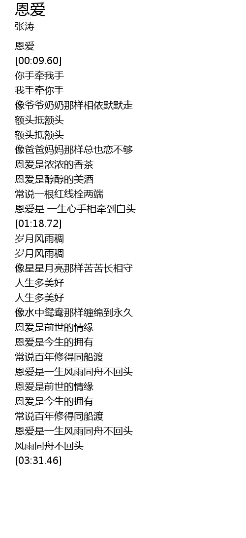 | [01:06.15] | ēn ài shì yī shēng xīn shǒu xiàng qiān dào bái tóu |