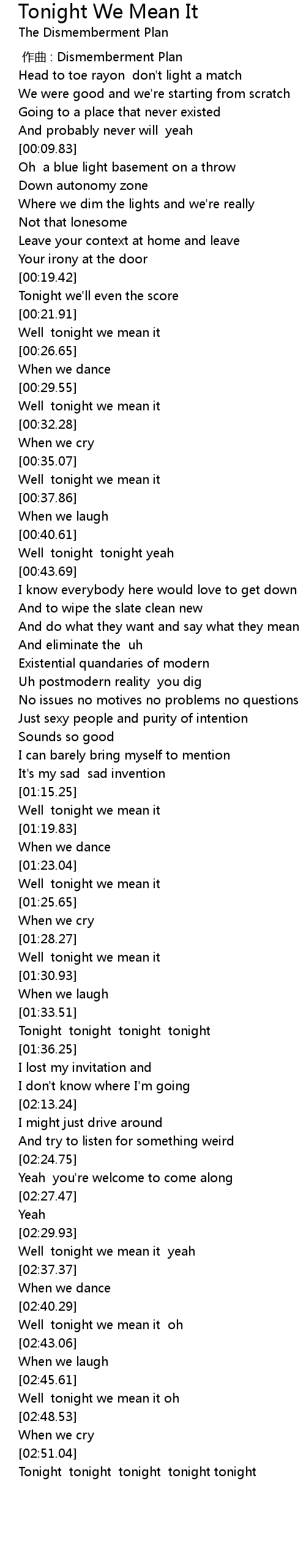 | [00:36.50] | Well tonight we mean it |