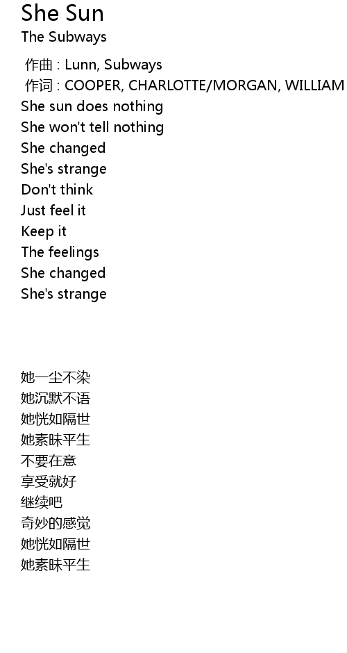 | [00:01.00] | 作词 : COOPER, CHARLOTTE/MORGAN, WILLIAM |