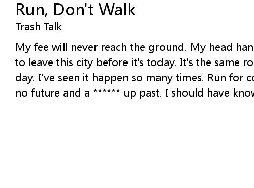 | My fee will never reach the ground. My head hangs in the ******* clouds. I need to leave this city before it's today. It's the same routine every *******ign day. I've seen it happen so many times. Run for cover, walk the line. Here's to no future and a ****** up past. I should have known I'd never ******* last |