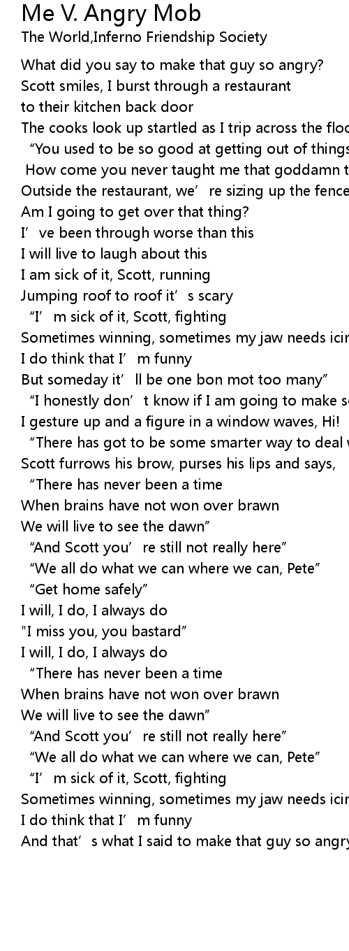 | Song | Me V. Angry Mob |