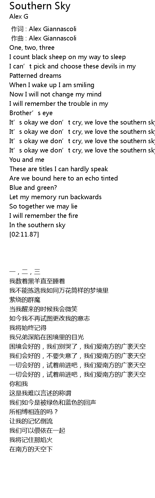 | [01:12.57] | It’s okay we don’t cry, we love the southern sky |