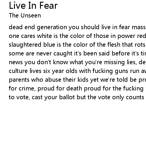 dead end generation you should live in fear mass destruction, corruption and no one cares white is the color of those in power red is the blood of the millions slaughtered blue is the color of the flesh that rots murderers go free while some are never caught it's been said before it's time to listen tune into the news you don't know what you're missing lies, deceit, injustice this is how our culture lives six year olds with fucking guns run away youth on the fucking run parents who abuse their kids yet we're told be proud where we fucking live proud for crime, proud for death proud for the fucking poor who tried their best told to vote, cast your ballot but the vote only counts if you're the few in power. |