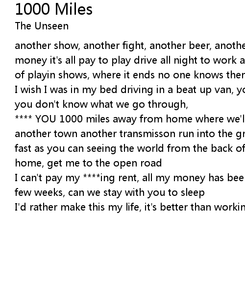 **** YOU 1000 miles away from home where we'll end up no one knows another city, another town another transmisson run into the ground but you gotta keep going as fast as you can seeing the world from the back of a van how long will we sit at home, get me to the open road |