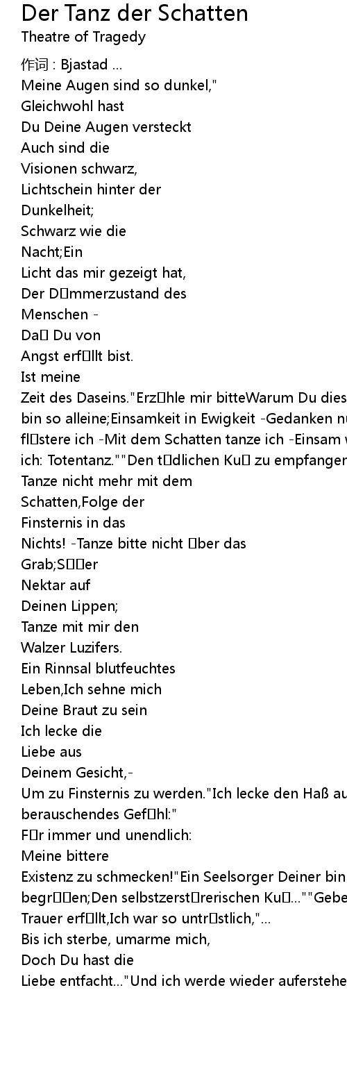 | Zeit des Daseins." Erz hle mir bitteWarum Du diese Angst in Dir tr gst!"" Ich bin so alleine Einsamkeit in Ewigkeit Gedanken nur f r mich, Mit dem Schatten fl stere ich Mit dem Schatten tanze ich Einsam wandere ich, Das Blut begehre ich: Totentanz."" Den t dlichen Ku zu empfangen" | |