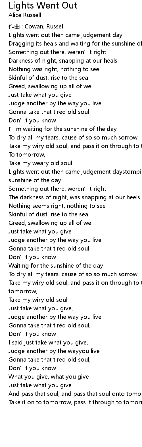 | Lights went out then came judgement daystomping its heals and waiting for the sunshine of the day | |