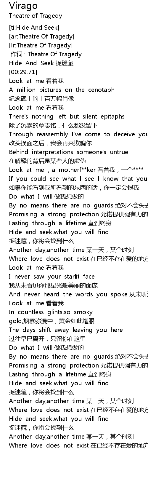 | [04:19.24] | Hide and seek,what you will find 捉迷藏,你将会找到什么 |