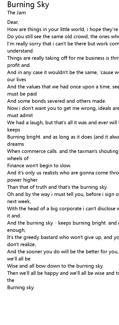 And the burning sky - keeps burning bright. and it won't turn off til it's had enough, |