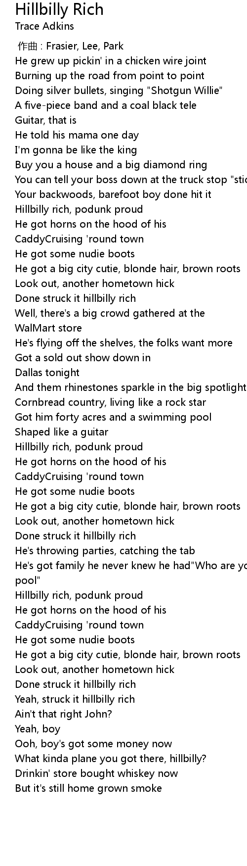 | [00:43.910] | Hillbilly rich, podunk proud |