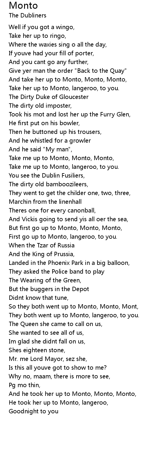 Take me up to Monto, Monto, Monto, |