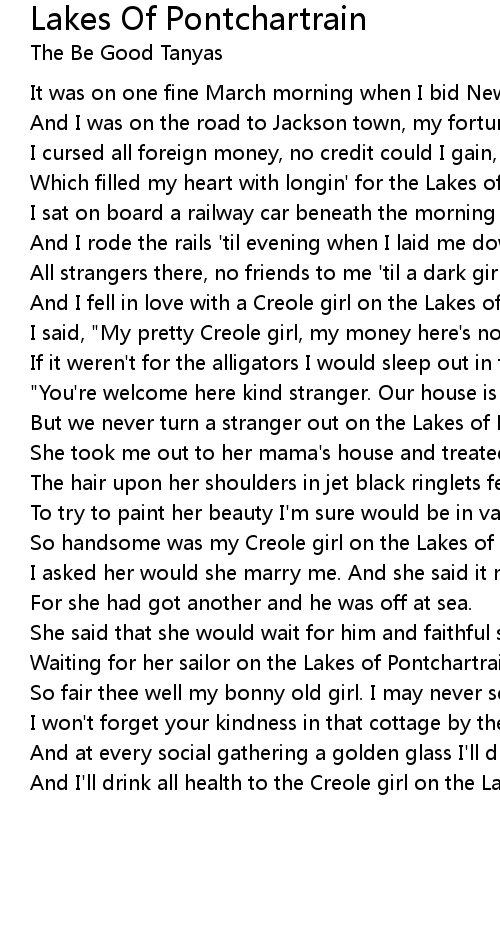 And I'll drink all health to the Creole girl on the Lakes of Pontchartrain. |