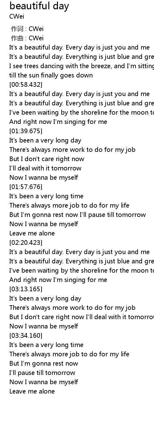 | [01:01.681] | It' s a beautiful day. Every day is just you and me |