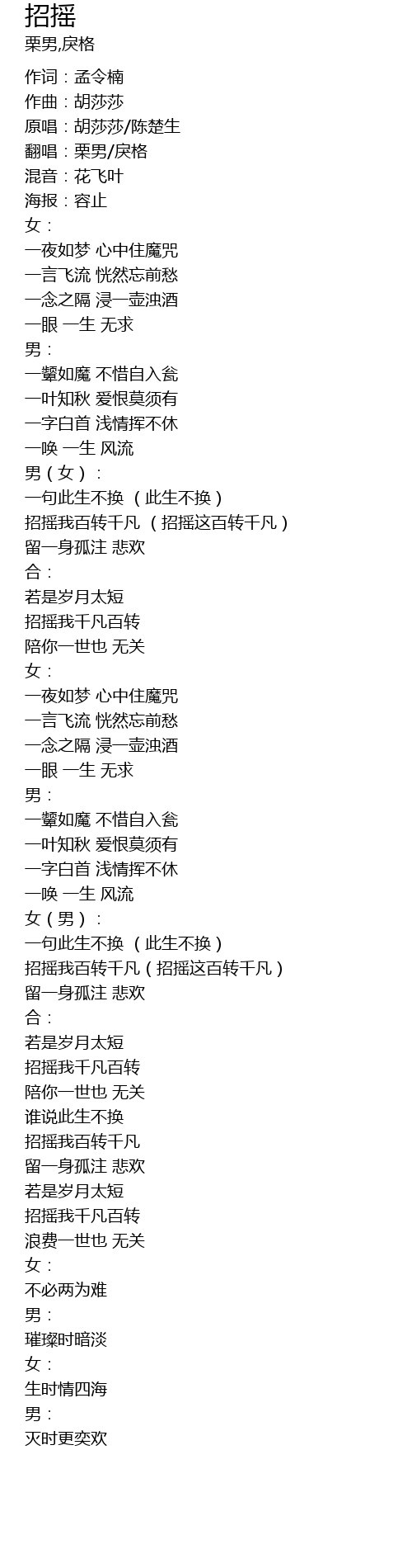 | [01:24.680] | zhāo yáo wǒ bǎi zhuǎn qiān fán zhāo yáo zhè bǎi zhuǎn qiān fán |
