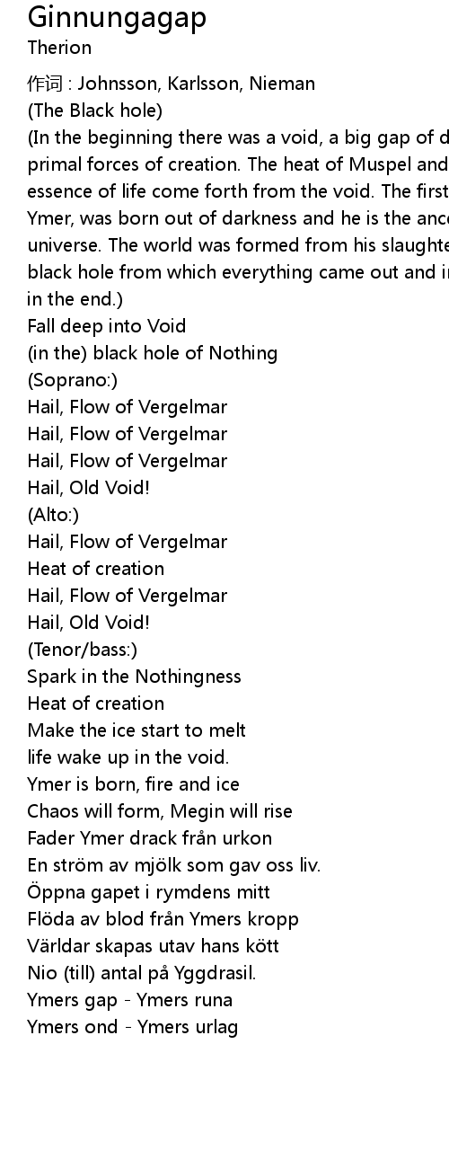 | (In the beginning there was a void, a big gap of darkness, filled with the primal forces of creation. The heat of Muspel and the ice of Nifel made the essence of life come forth from the void. The first living being, The Giant Ymer, was born out of darkness and he is the ancestor of the creatures of the universe. The world was formed from his slaughtered body. Ginnungagap is the black hole from which everything came out and into which everything will return in the end.) | |
