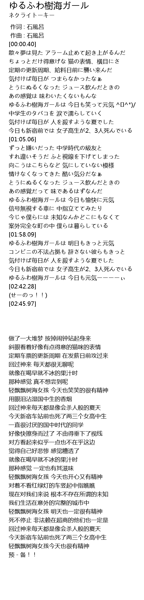 | [02:12.69] | ゆるふわ樹海ガールは 明日もきっと元気 |