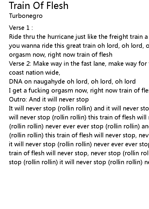 Ride thru the hurricane just like the freight train a freight train of flesh, you wanna ride this great train oh lord, oh lord, oh lord, i get a fucking orgasm now, right now train of flesh |
