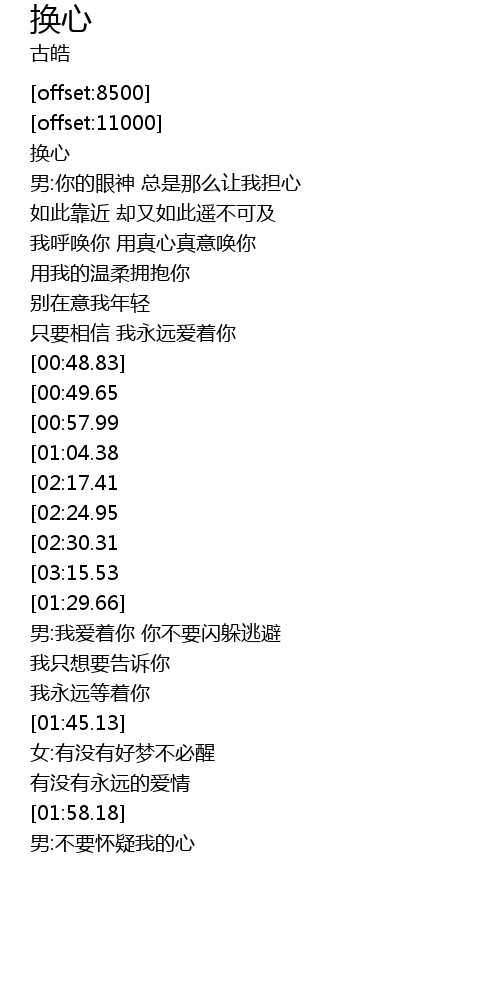 | [03:21.77][03:15.53][02:35.02][01:24.39] | 才能交换交换你的心 |