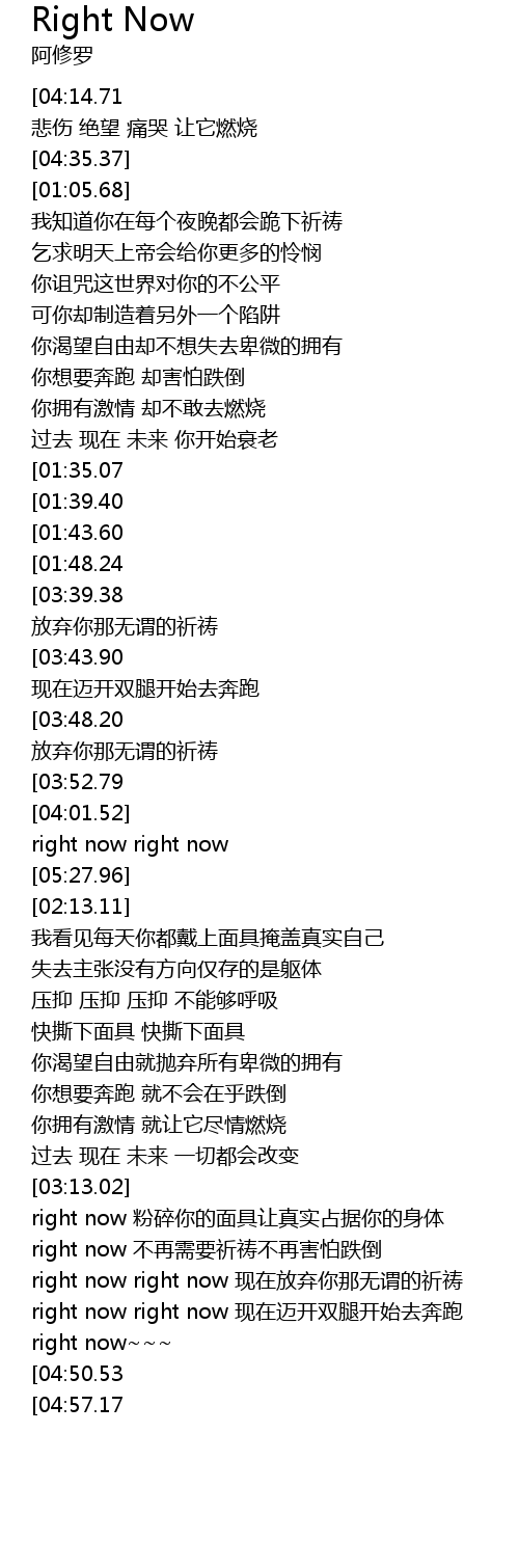 | [05:17.06][03:48.20][03:03.55][02:01.65] | right now right now 放弃你那无谓的祈祷 |