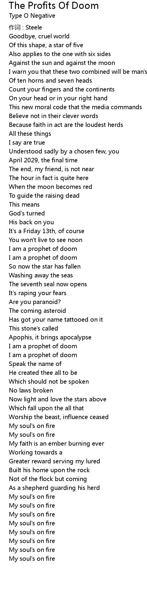 | Song | The Profits Of Doom |