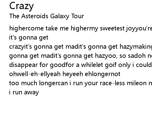highercome take me highermy sweetest joyyou're my loveyou're my fallfirei'm your admirerguess we're blinded by the writings on the wall[chorus]it's gonna get crazyit's gonna get madit's gonna get hazymaking me sadit's gonna get crazyit's gonna get madit's gonna get hazyoo, so sadoh nocan we have no noplease help me disappear for goodfor a whilelet goif only i could let goof the echoes in my mind from this love cry- i..i..ing[chorus]ohwell-eh-ellyeah heyeeh ehlongernot too much longercan i run your race-less mileon my facethundermy little wonderwe're more than closer to the end of our days[chorus]i run away |