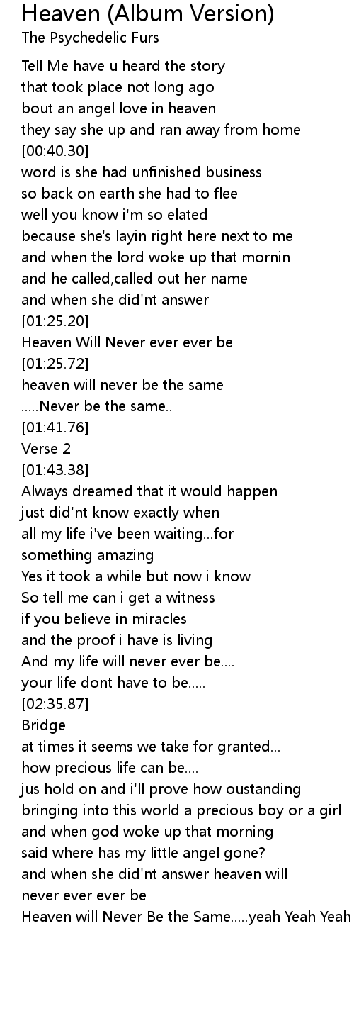 [03:24.72] Heaven will Never Be the Same.....yeah Yeah Yeah