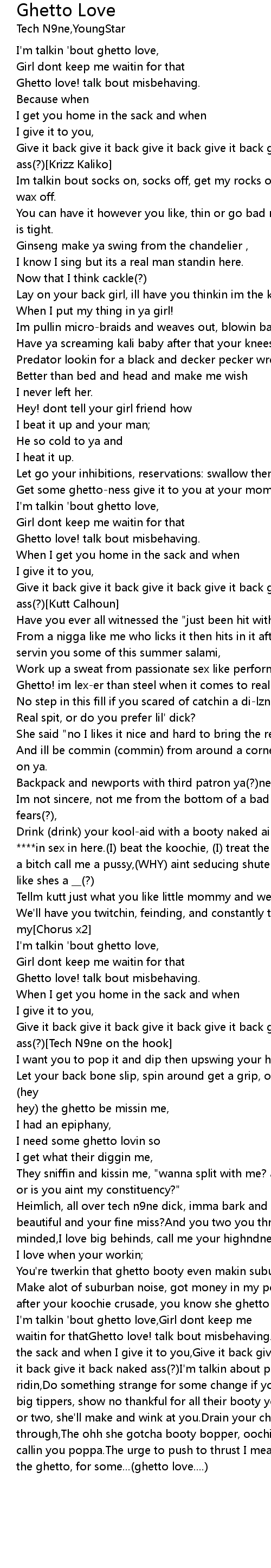 | Make alot of suburban noise, got money in my pocket like im a turban boy."So after your koochie crusade, you know she ghetto if she come and bring you kool-aid (ohhh yeahh)[Chorus x2]I'm talkin 'bout ghetto love,Girl dont keep me waitin for thatGhetto love! talk bout misbehaving.Because when I get you home in the sack and when I give it to you,Give it back give it back give it back give it back give it back naked ass(?)I'm talkin about pole slidin, lap dance ridin,Do something strange for some change if your buying,But big strippers make big tippers, show no thankful for all their booty you give us.For just a drink or two, she'll make and wink at you.Drain your change till she think you're through,The ohh she gotcha booty bopper, oochie wobbble watch ya while she callin you poppa.The urge to push to thrust I mean to shove takes you back to the ghetto, for some...(ghetto love....) |