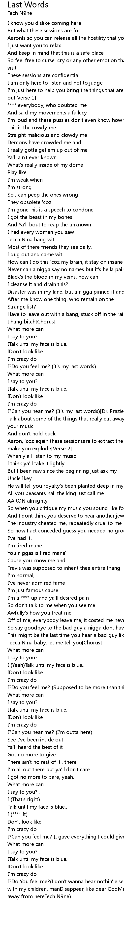 | I?Do You feel me?(I don't wanna hear nothin' else man, I just wannaGo somewhere with my children, manDisappear, like dear GodMake me a bird so I can flyFly far away from hereTech N9ne) |
