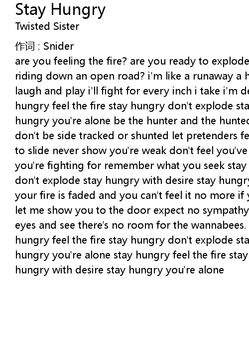 | are you feeling the fire? are you ready to explode? are your dreams and desires riding down an open road? i' m like a runaway a heart without a home others can laugh and play i' ll fight for every inch i take i' m desperate to the bone stay hungry feel the fire stay hungry don' t explode stay hungry with desire stay hungry you' re alone be the hunter and the hunted keep your target in your sight don' t be side tracked or shunted let pretenders feel your bite and if you start to slide never show you' re weak don' t feel you' ve got to hide remember what you' re fighting for remember what you seek stay hungry feel the fire stay hungry don' t explode stay hungry with desire stay hungry you' re alone all right! if your fire is faded and you can' t feel it no more if you' re tired and overrated let me show you to the door expect no sympathy there' s none to be had open your eyes and see there' s no room for the wannabees. the has beens or the bad stay hungry feel the fire stay hungry don' t explode stay hungry with desire stay hungry you' re alone stay hungry feel the fire stay hungry don' t explode stay hungry with desire stay hungry you' re alone |