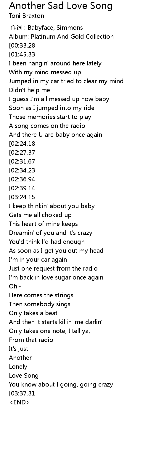| [01:19.71][02:24.18][03:06.46] | It' s just another sad love song |