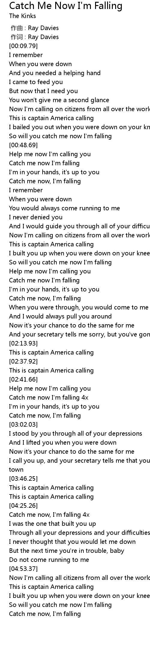 | [00:43.72] | So will you catch me now I'm falling |