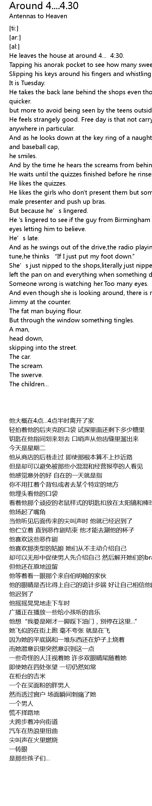 | [00:20.25] | He leaves the house at around 4... 4: 30. |