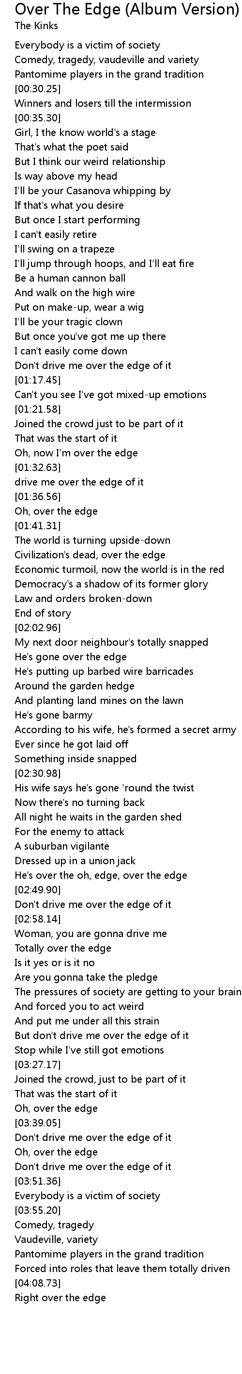 | [02:44.64] | He's over the oh, edge, over the edge |
