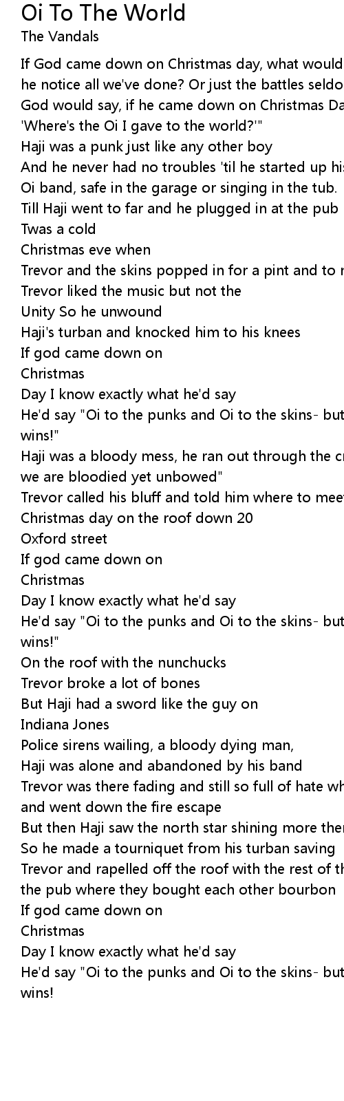 If God came down on Christmas day, what would he think? what would he say? Would he notice all we've done? Or just the battles seldom won? I think I know what God would say, if he came down on Christmas Day. He'd say to every boy and girl, 'Where's the Oi I gave to the world?'" |