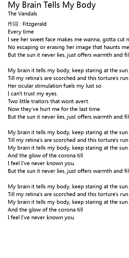 | Till my retina' s are scorched and this torture' s run it' s course for me. | |