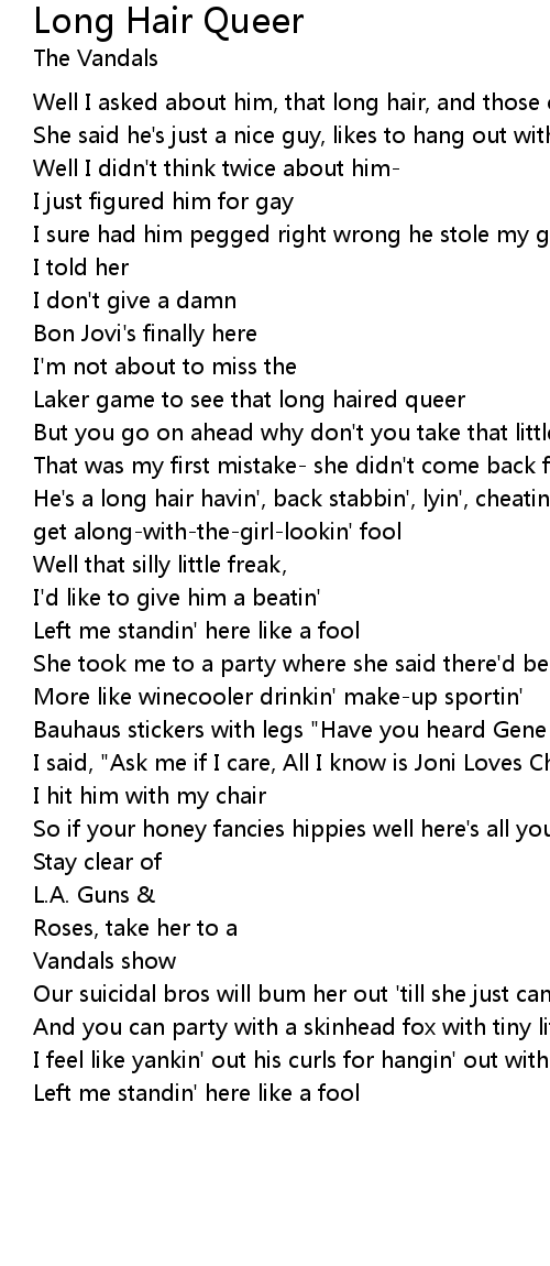 He's a long hair havin', back stabbin', lyin', cheatin', dirty little freakin' get along-with-the-girl-lookin' fool |