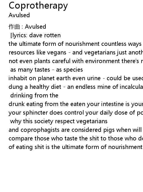 | music: juancar 9 98 lyrics: dave rotten scatophagy the art of eating shit is the ultimate form of nourishment countless ways of feeding on with costless resources like vegans and vegetarians just another philosophy eat no meat not even plants careful with environment there' s no waste no useless scraps recycling every single bit coprotherapy i x2 as many tastes as species inhabit on planet earth even urine could be used to digest a hard piece of dung a healthy diet an endless mine of incalculable proportions the solution to famine is right on everybody' s ass coprotherapy i x2 drinking from the drunk eating from the eaten your intestine is your stock with always warmy food your sphincter does control your daily dose of pooh your ing tiresome piles tells you when' s the time bridge: x2 why this society respect vegetarians and coprophagists are considered pigs when will be the day when we equally compare those who taste the shit to those who don' t eat meat scatophagy the art of eating shit is the ultimate form of nourishment |