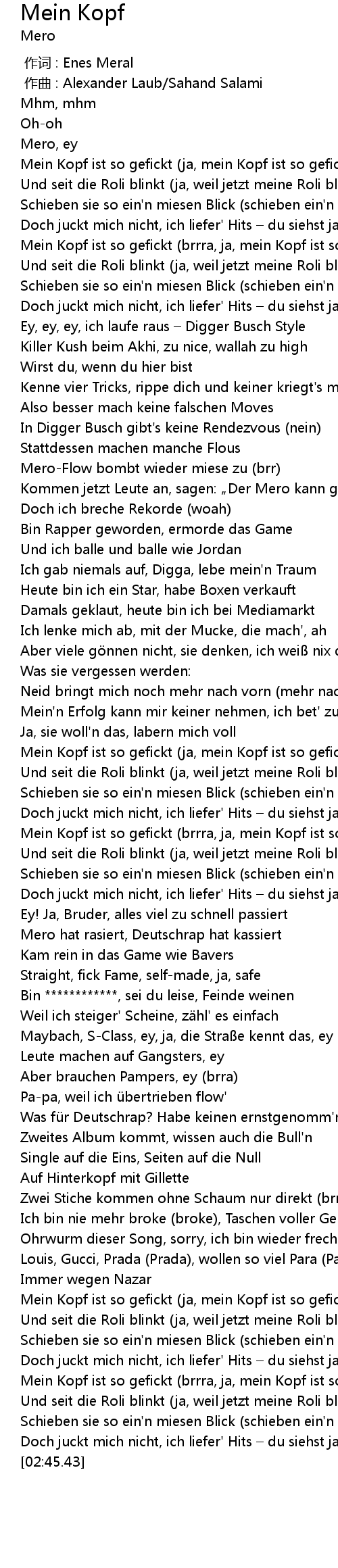 | [02:32.37] | Mein Kopf ist so gefickt brrra, ja, mein Kopf ist so gefickt, ja |