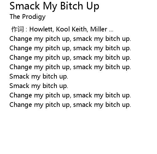 | [01:25.14] | Change my pitch up, smack my bitch up. |