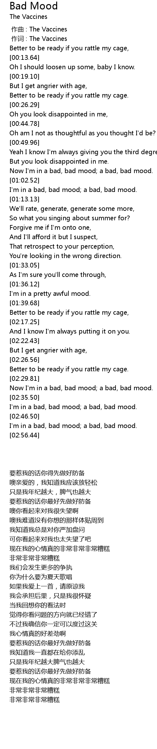 | [02:50.31] | I'm in a bad, bad mood; a bad, bad mood. |