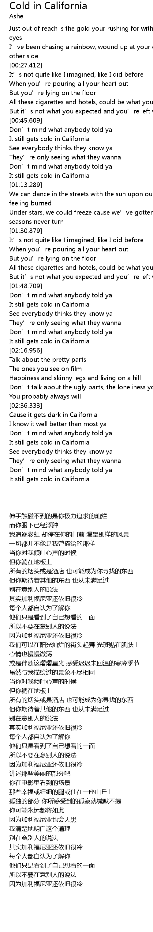 | [01:22.414] | Under stars, we could freeze cause we' ve gotten used to heat where seasons never turn |