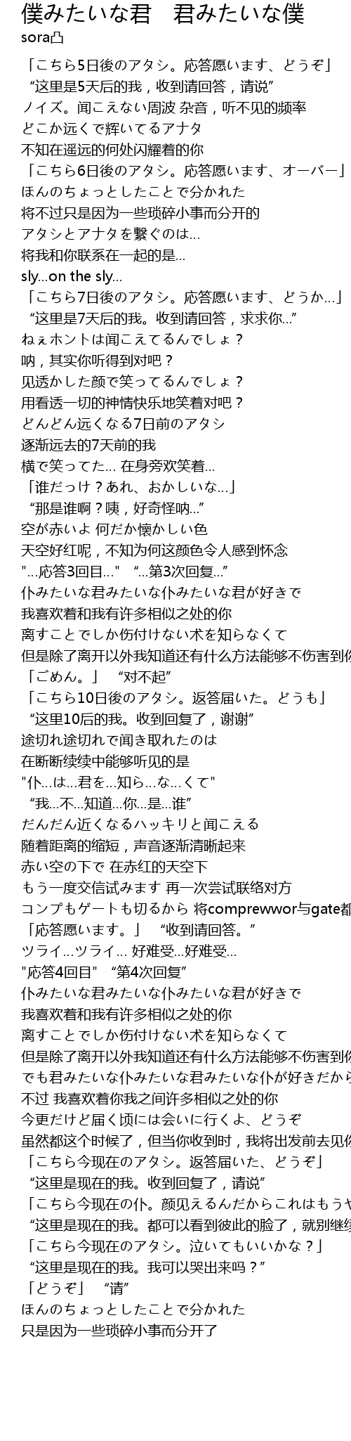 | [03:24.488] | でも君みたいな仆みたいな君みたいな仆が好きだから 不过 我喜欢着你我之间许多相似之处的你 |