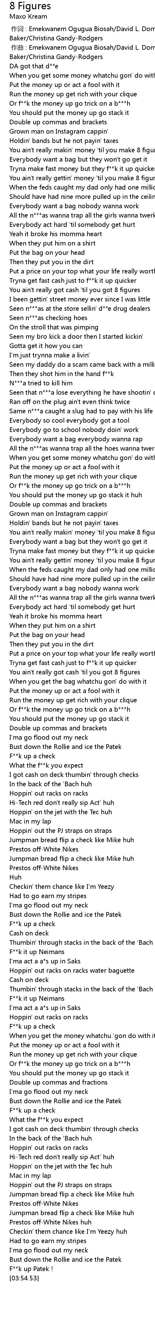 | [01:49.99] | You ain't really gettin' money 'til you make 8 figures |
