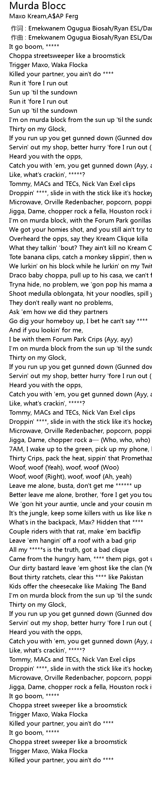 | [00:50.95] | What they talkin' 'bout? They ain't kill no Kream Clique ***** |